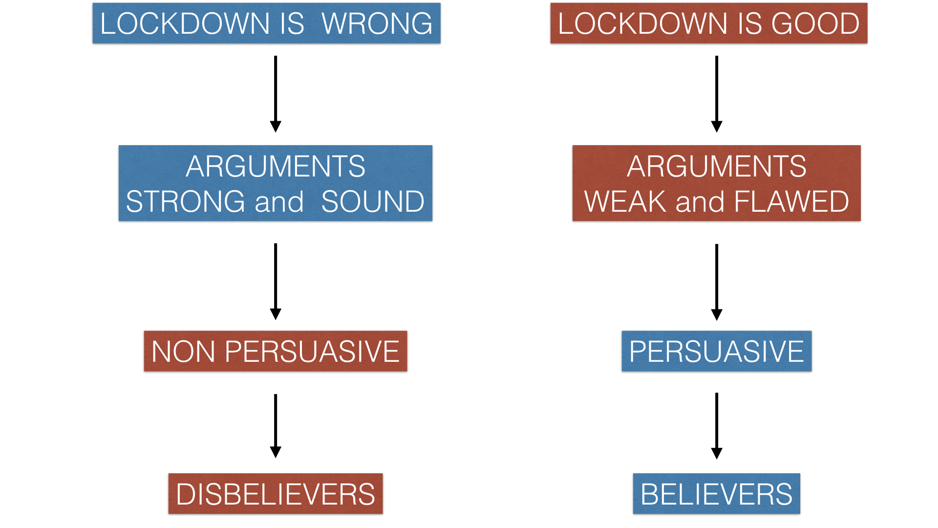 Therefore, many statements and policies, backed up by weak and flawed arguments, can persuade the mass, leveraging on their fear (e.g. fear of death), their biases (e.g. anthropocentric bias, teleological bias, action bias, etc.) and their naive thinking.