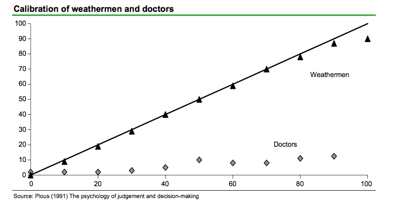 It largely appears to relate to the illusion of knowledge (defined as a situation where we think we know more than everyone else). Weather men get rapid undeniable evidence on their abilities as forecasters, after all you have to do is look out of the widow to see if they managed to get it right or not. Doctors, in contrast, often lack feedback so find it far harder to know when they have been right or wrong.