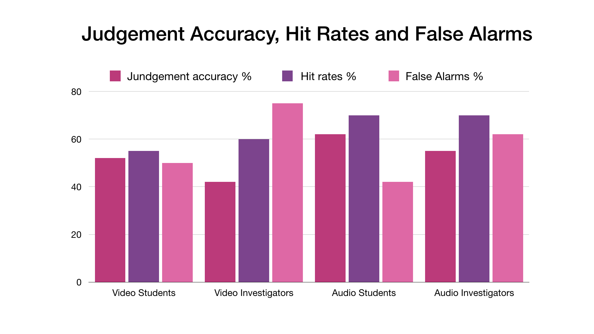 Across all participants (professionals and students) and all conditions (video and audio) the average overall accuracy rating was 53.9%, statistically indifferent from a pure chance performance!