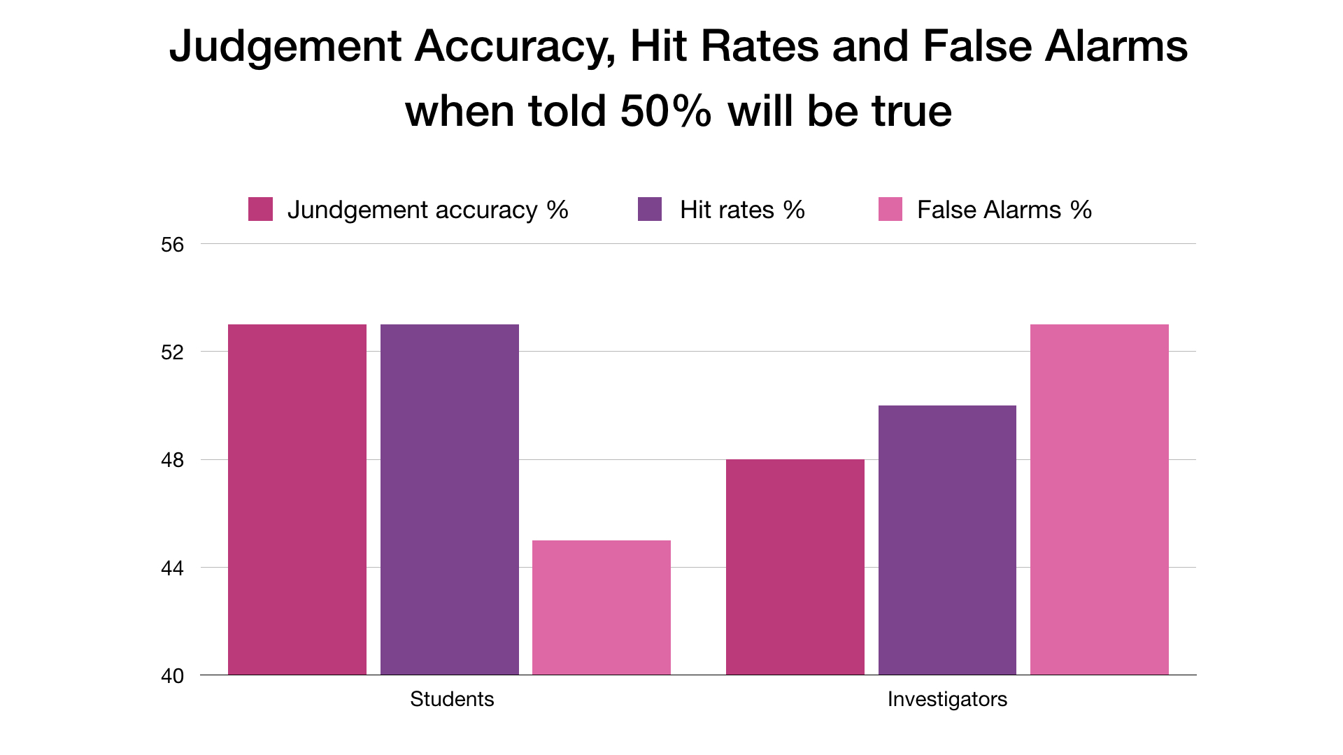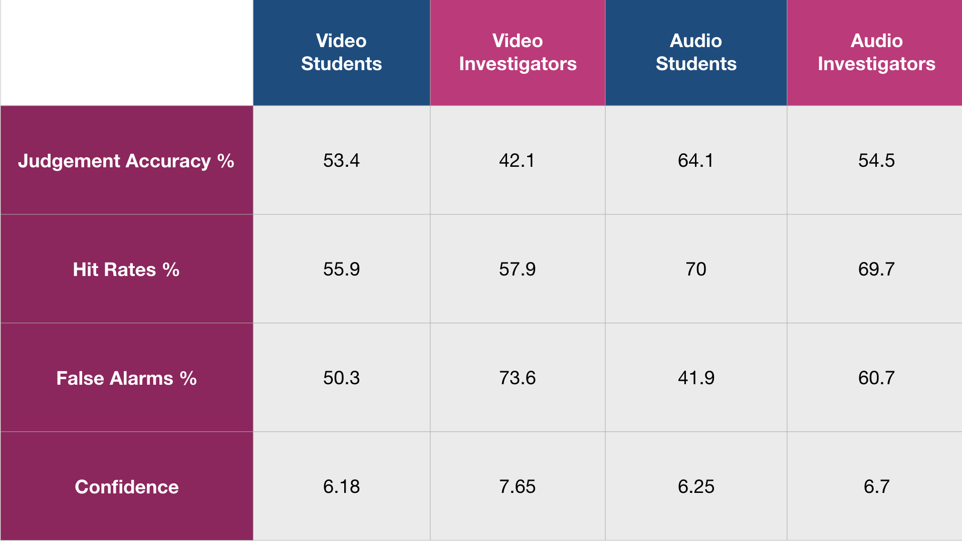 It is worth noting that the investigators pretty much thought everyone was guilty. That is to say they had a much higher rate of false alarms (that is false confessions perceived as true) than the students did. This has become known as investigator bias.